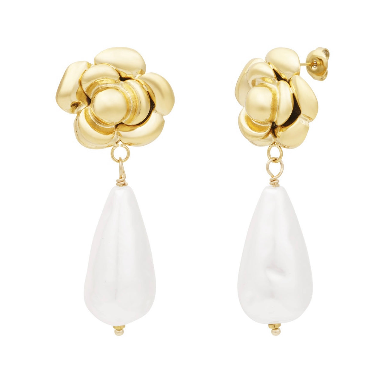 Deze verfijnde goudkleurige oorbellen zijn een ode aan pure elegantie. Het bloemdesign straalt romantiek en klasse uit, terwijl de subtiel hangende druppelvormige imitatieparel zorgt voor een zachte, luxueuze uitstraling. Gemaakt van hoogwaardig stainless steel met een goudkleurige afwerking, waardoor ze duurzaam, kleurvast en huidvriendelijk zijn.