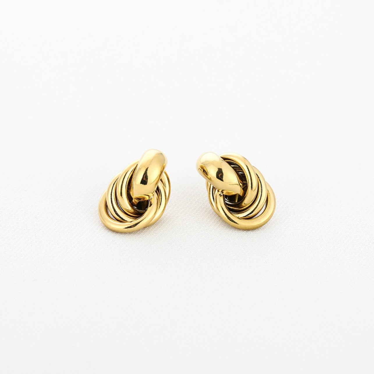 Deze goudkleurige knot oorbellen hebben een elegant gevlochten design met meerdere in elkaar verweven ringen. Het compacte formaat gecombineerd met de glanzende afwerking zorgt voor een stijlvolle statement look: tijdloos, vrouwelijk en modern.