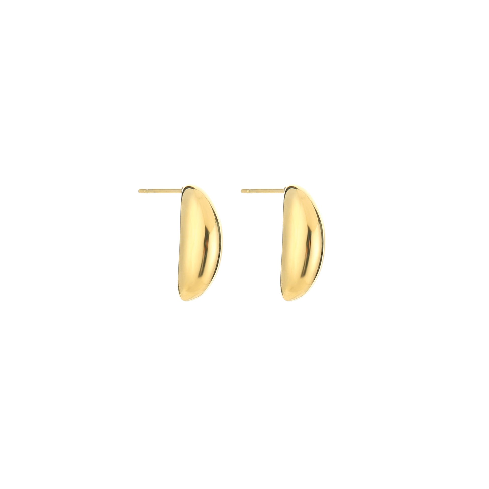 Deze goudkleurige oorbellen hebben een strak en modern design met een elegante, gebogen vorm. De gladde afwerking en subtiele glans geven ze een luxe uitstraling, terwijl het minimalistische silhouet zorgt voor een tijdloze look.