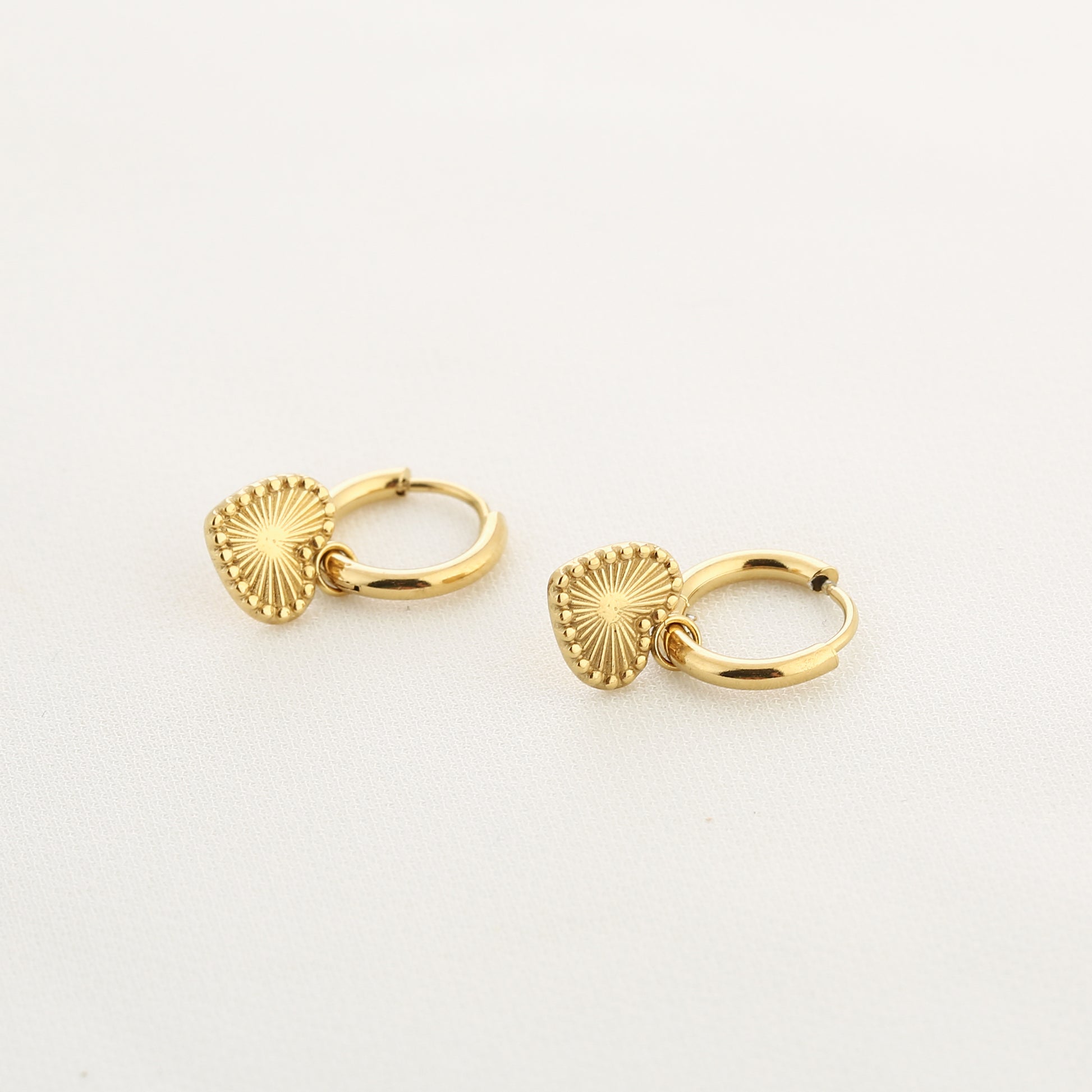 Deze elegante goudkleurige oorringen met een hartvormige bedel zijn een echte eyecatcher. De combinatie van de klassieke oorring met het gedetailleerde, gestructureerde hartje geeft de oorbellen een romantische en tijdloze uitstraling. De subtiele reliëfstructuur vangt het licht prachtig en zorgt voor een luxe finish.
